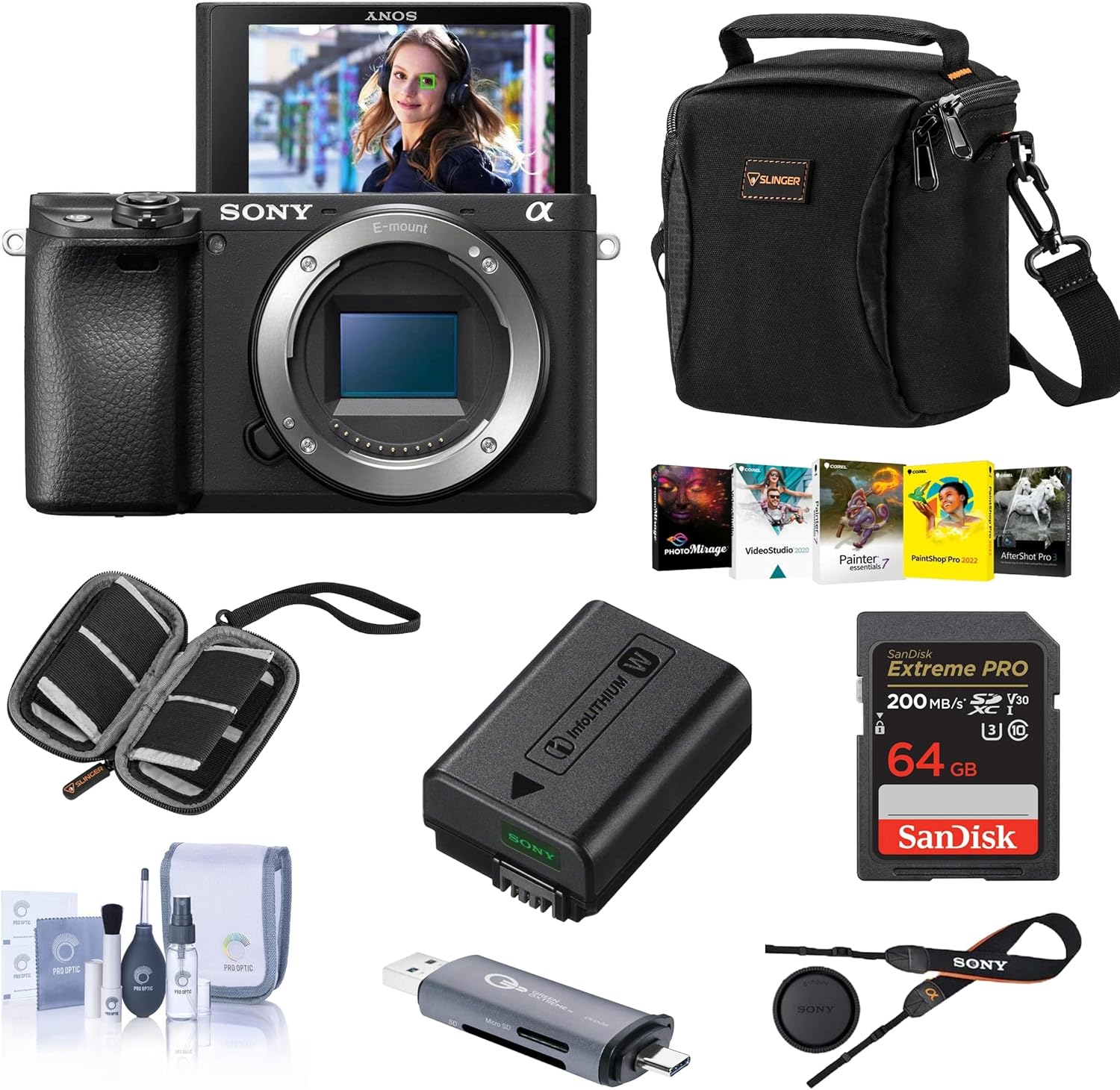 The Sony Alpha a6400 Mirrorless Digital Camera Bundle offers a perfect blend of cutting-edge technology and essential accessories for a seamless creative journey. Capture high-resolution photos and cinematic 4K videos with this versatile camera. The bundle includes everything you need to get started, including a shoulder bag, SD card, cleaning kit, and software suite. **Specifications:** * Camera: Sony Alpha a6400 * Sensor: 24.2MP APS-C CMOS * Processor: BIONZ X * Video: UHD 4K * Focus System: 4D FOCUS with Real-time Eye AF * ISO: 100-51200 * Continuous Shooting: 11 fps * Connectivity: Bluetooth, Wi-Fi, Micro USB, NFC * Kit Includes: Camera, Shoulder Bag, 64GB SD Card, Cleaning Kit, Card Reader, SD Card Case, Corel PC Software KitWe partner with Amazon and other retailers to provide accurate product information and convenient access to purchase options. As an Amazon Associate we earn from qualifying purchases.