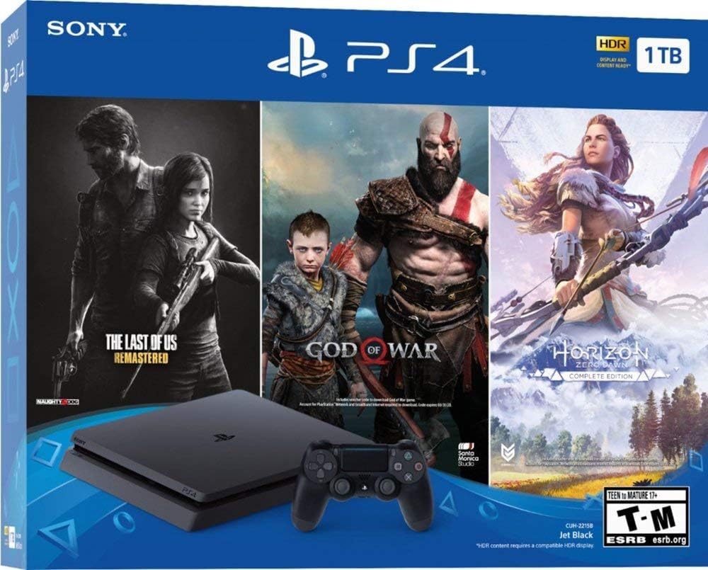 Unleash a world of gaming adventures with the PlayStation 4 Slim 1TB bundle. This exclusive edition comes with three blockbuster games: The Last of Us, God of War, and Horizon Zero Dawn. Dive into captivating narratives and stunning graphics, all powered by the reliable performance of the PS4 Slim. The package includes a Jet Black Dualshock 4 wireless controller for seamless gameplay.
