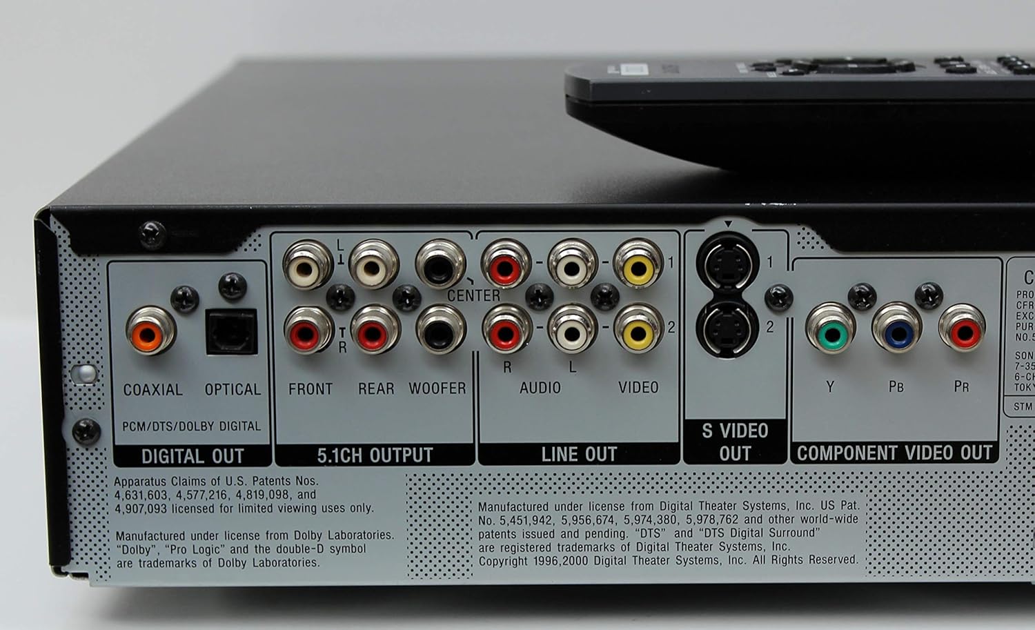- Outputs: Component video, S-video (x2), composite/RCA (x2), optical, and coaxial