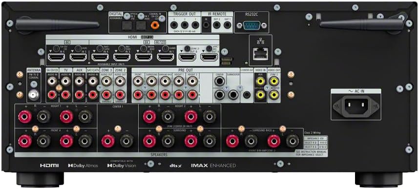 **Specifications:** * **Channels:** 11.2 CH * **Power Output:** 130W + 130W (8ohms, 1kHz, 2ch, THD 0.9%) * **HDMI Connectivity:** 8K & 4K/120 with HDMI 2.1 support (7-in/2-out) * **Object-Based Sound:** Dolby Atmos & DTSX decoding * **Acoustic Calibration:** Digital Cinema Auto Calibration IX and 360 Spatial Sound Mapping * **HDR Support:** Dolby Vision, HDR10, Hybrid Log Gamma, IMAX Enhanced * **Wireless:** Bluetooth, Wi-Fi, Chromecast built-in, Spotify Connect, Apple AirPlay * **Voice Control:** Compatible with Google Assistant * **Integration:** Works With SONOS, Seamless IP Control integration with leading control systemsWe partner with Amazon and other retailers to provide accurate product information and convenient access to purchase options. As an Amazon Associate we earn from qualifying purchases.