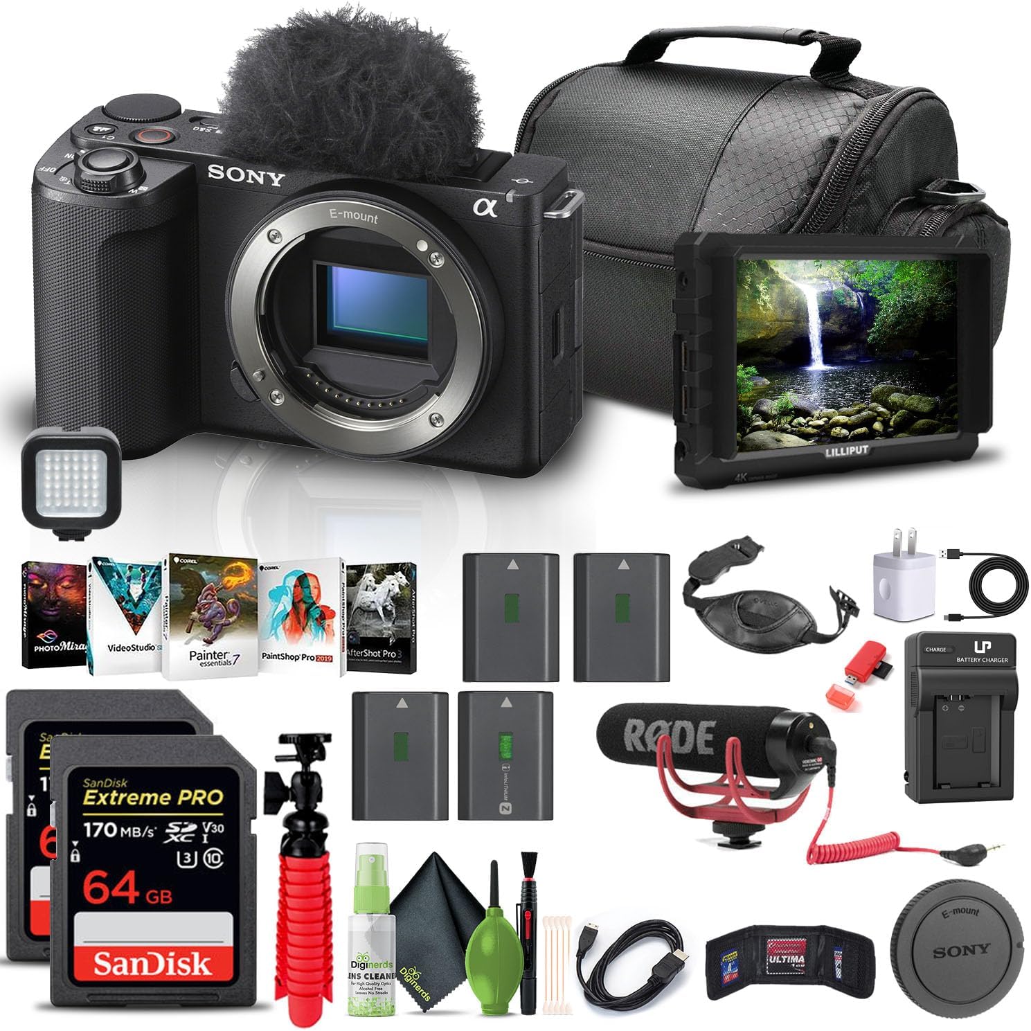 - Included Accessories: Lilliput A7S 7" Full HD Monitor, Rode VideoMic GO Camera-Mount Shotgun Microphone, 2 x SecureDigital 64GB Extreme PRO Memory Card, Photo Software With PhotoMirage, AfterShot, Painter Essentials, PaintShop Pro, and Video Studio, Soft Bag, 3 x NP-FZ100 Battery, NPF-NP-FZ100 Charger, Memory Card Reader, Led Light, Micro HDMI Cable, 12 inch Flexible Tripod, Hand Strap, Memory Card Wallet, Cleaning Kit