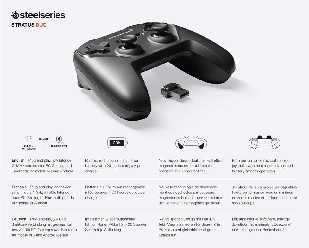 The SteelSeries Stratus Duo is your go-to wireless controller for gaming across multiple platforms. Seamlessly switch between Bluetooth for Android mobile gaming and 2.4GHz wireless for Windows and Steam, enjoying a console-like experience on any device. With its comfortable design, responsive controls, and long-lasting battery, the Stratus Duo is perfect for gaming at home or on the go.