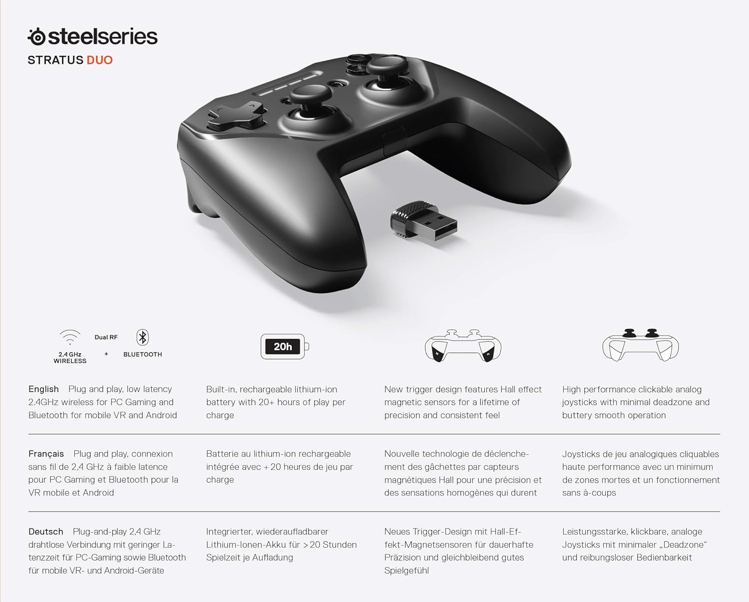 The SteelSeries Stratus Duo Wireless Gaming Controller delivers a true console-like gaming experience across multiple platforms. Whether you're gaming on Android, Windows, Chromebook, or VR, enjoy responsive controls and versatile connectivity.