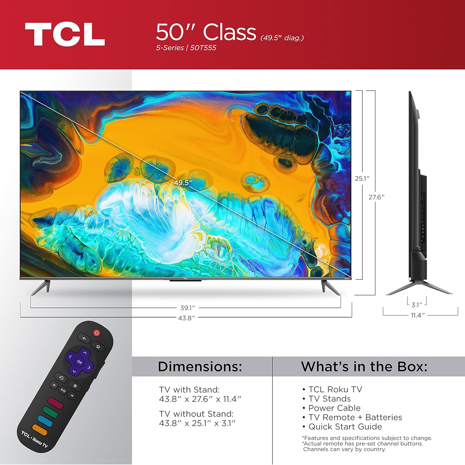 Overview: The TCL 55" Class 5-Series QLED 4K UHD Roku TV delivers exceptional picture quality and endless entertainment. Featuring Quantum Dot technology, Dolby Vision & Atmos, VRR, and AMD FreeSync, this smart TV is perfect for movies, gaming, and streaming. The AiPQ Engine enhances color, contrast, and clarity for an unrivaled 4K HDR experience. Specifications: * **Brand:** TCL * **Model:** 55T555 (2022 Model) * **Screen Size:** 55 inches * **Resolution:** 4K UHD * **Display Technology:** QLED (Quantum Dot) * **HDR:** Dolby Vision, HDR10, HDR10+, HLG * **Smart TV Platform:** Roku TV * **Gaming Features:** VRR (Variable Refresh Rate), AMD FreeSync, Auto Game Mode * **Audio:** Dolby Atmos * **Processor:** AiPQ Engine * **Color:** BlackWe partner with Amazon and other retailers to provide accurate product information and convenient access to purchase options. As an Amazon Associate we earn from qualifying purchases.