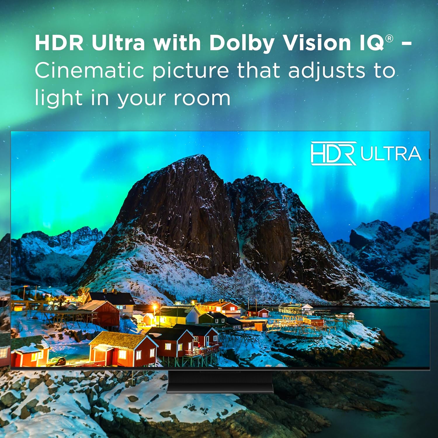 **Specifications:** * **Resolution:** 4K UltraHD * **Display Technology:** QD-Mini LED, QLED * **Local Dimming Zones:** Up to 1,500+ * **Peak Brightness:** Up to 1,500 nits * **Panel Refresh Rate:** 120Hz (144 Hz Variable Refresh Rate) * **Motion Rate:** 480 with MEMC Frame Insertion * **HDR Support:** HDR ULTRA with Dolby Vision IQ, HDR10+, HDR10, & HLG * **Game Accelerator:** 240 VRR * **Audio Technology:** Dolby Atmos, DTS Virtual:X, ONKYO speaker system with built-in subwoofer * **Processor:** TCL AIPQ PRO Processor with Deep Learning AI * **Operating System:** Google TV * **Connectivity:** Bluetooth, Wi-Fi, USB, Ethernet, HDMI * **Special Features:** Built-In Speaker, Game Mode, Chromecast, Wide Color Enhancer, Bezel-Less Design * **Supported Internet Services:** Netflix, HBO Max, Disney Plus, Hulu, YouTubeWe partner with Amazon and other retailers to provide accurate product information and convenient access to purchase options. As an Amazon Associate we earn from qualifying purchases.