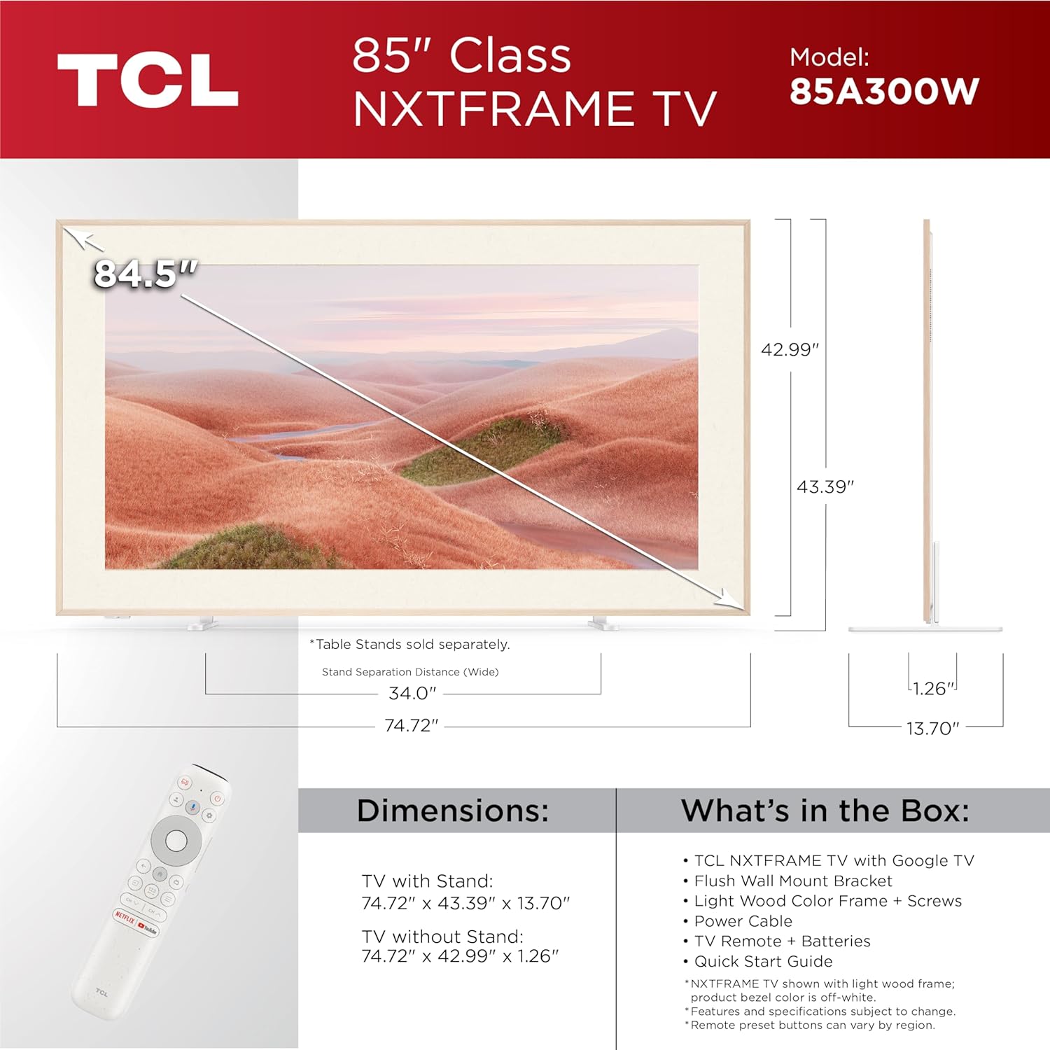 The TCL 85-Inch Class QLED 4K Smart NXTFRAME TV combines cutting-edge picture technologies with a stunning design. Featuring QLED PRO Quantum Dot technology, Dolby Vision HDR, and a built-in Google Assistant, this TV transforms your living room into a personal studio.