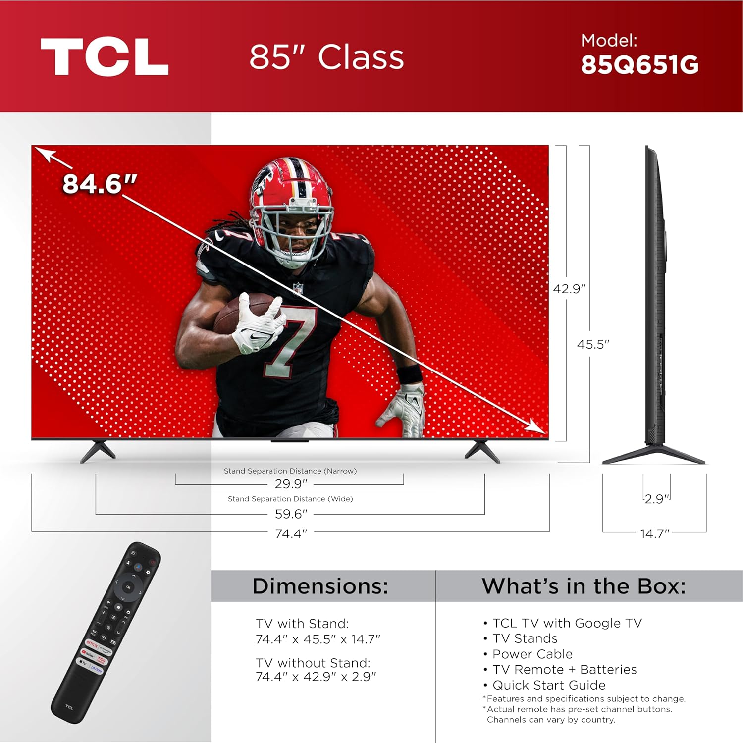 - Special Features: Built-In Speaker, Game Mode, Chromecast, Wide Color Enhancer, Bezel-Less Design