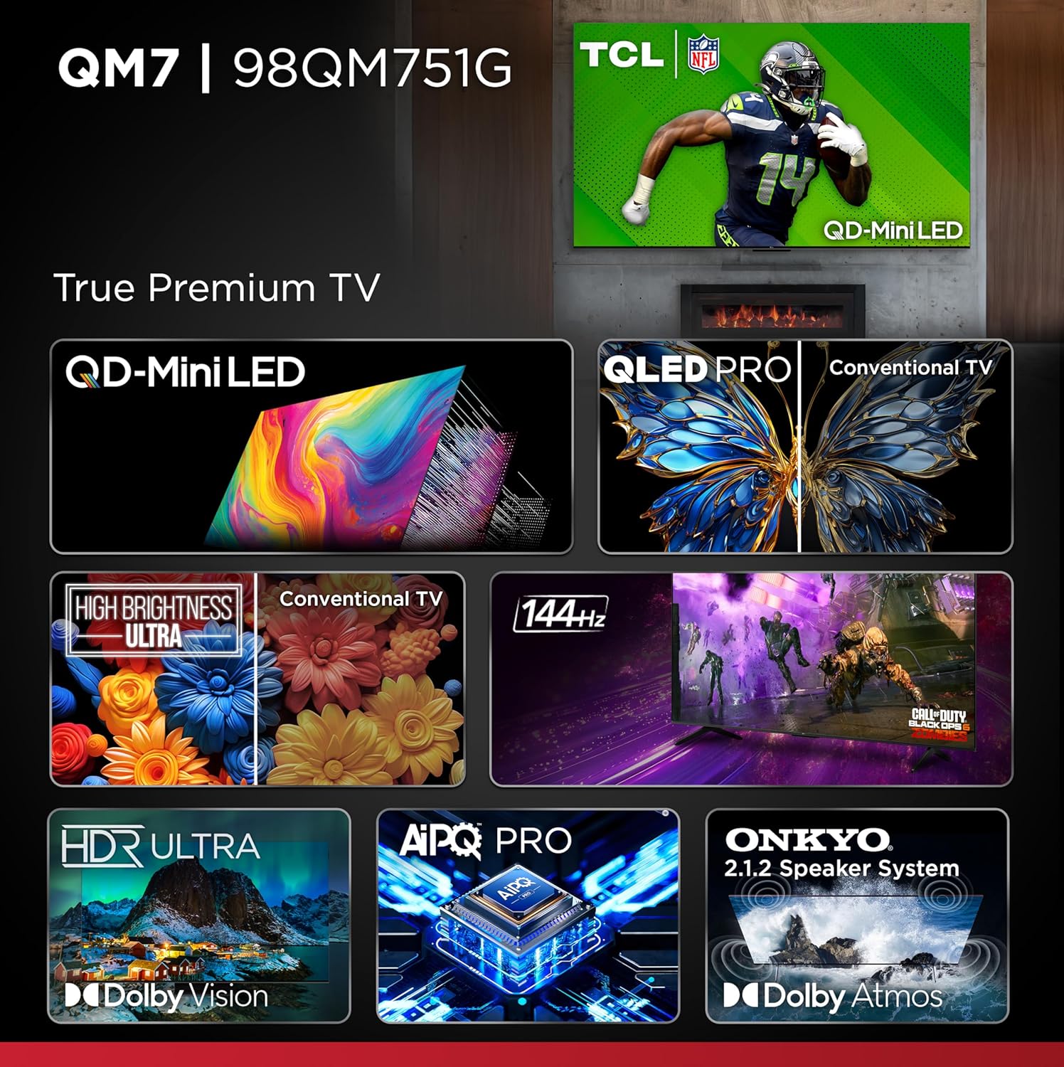 Experience the pinnacle of home entertainment with the TCL QM7 Series. Featuring QD-Mini LED technology, Dolby Vision IQ, and an integrated ONKYO sound system, this TV delivers stunning visuals and immersive audio for a truly cinematic experience.
