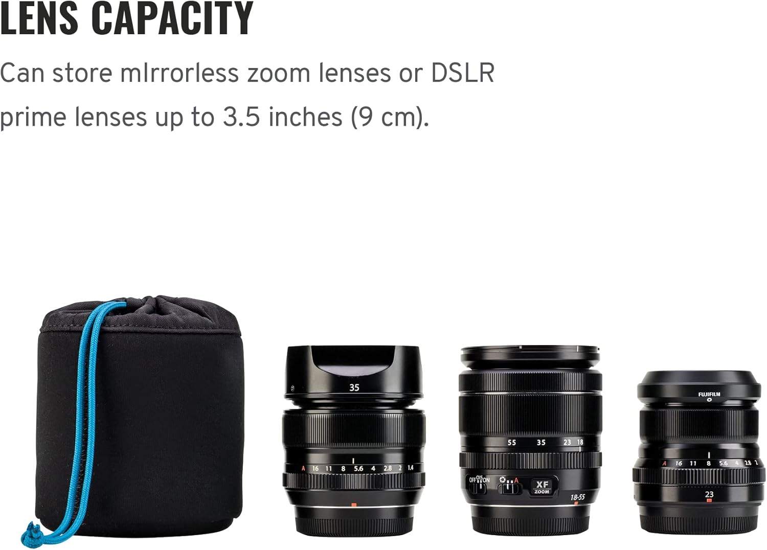 - Capacity: Mirrorless zoom lenses or DSLR prime lenses up to 3.5 inches (9 cm)