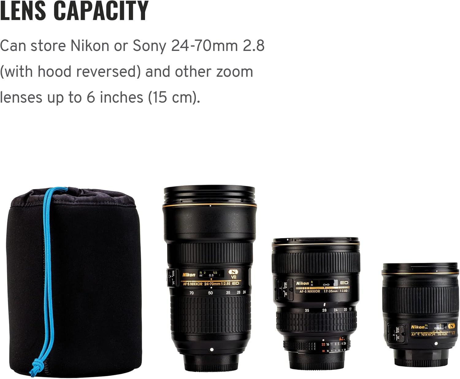 - Capacity: Nikon or Sony 24-70mm 2.8 (with hood reversed) and other zoom lenses up to 6 inches (15 cm).