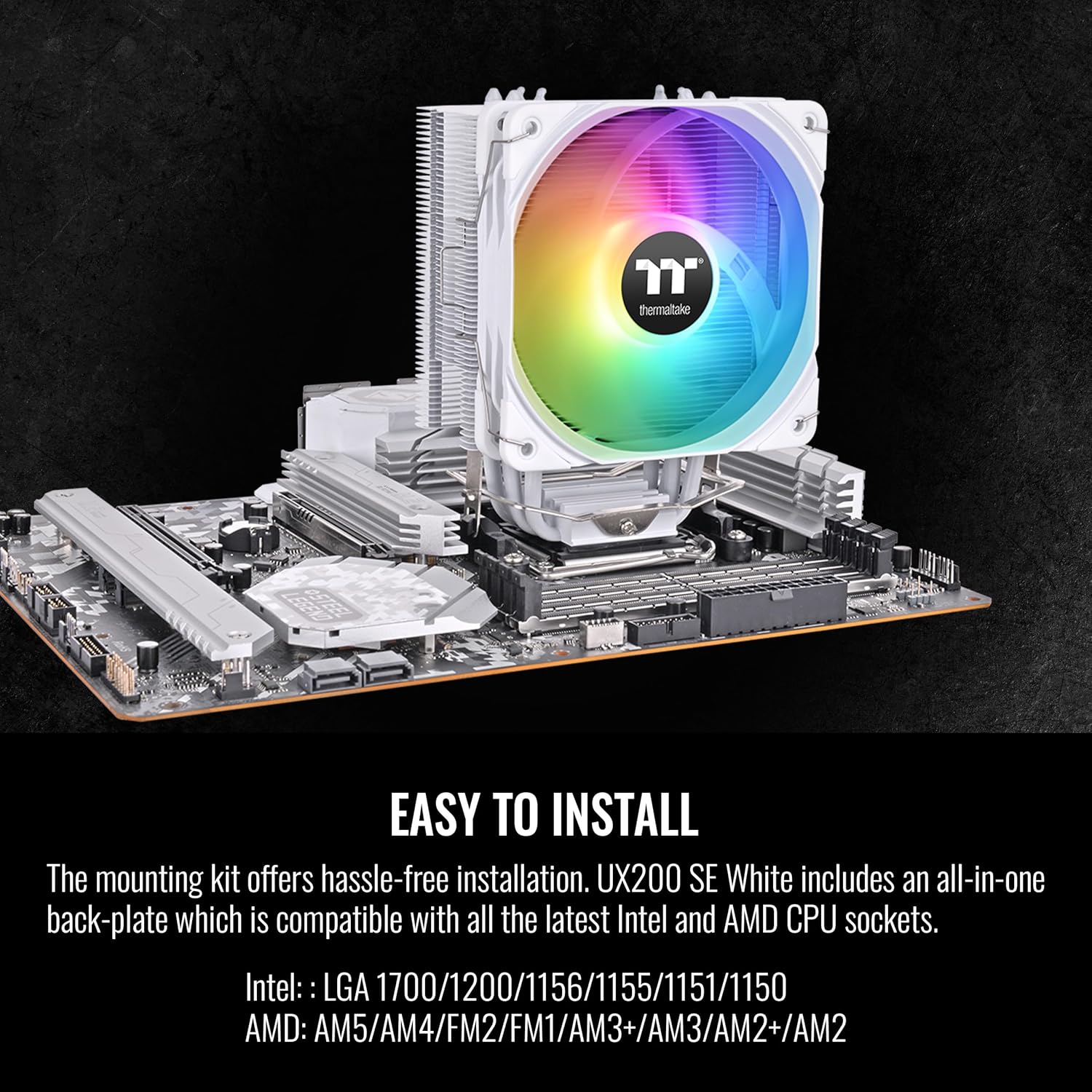 The Thermaltake UX200 SE White CPU Cooler combines effective cooling with vibrant ARGB lighting. Designed for universal socket compatibility and easy installation, this cooler delivers optimal performance and style.