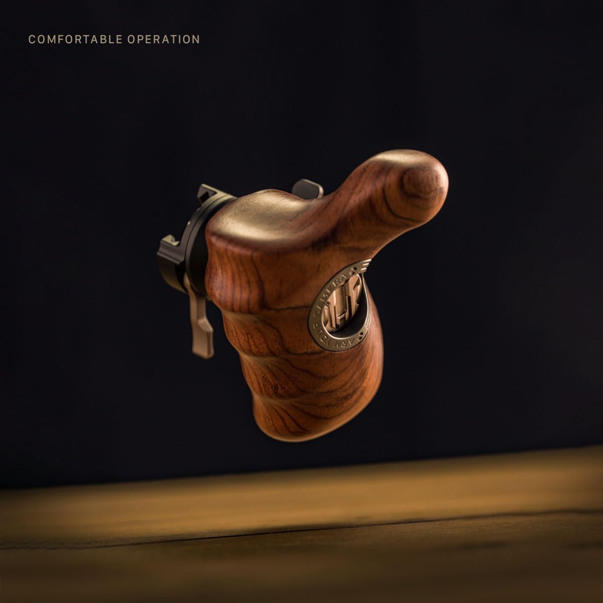 The Tiltaing Advanced Left Side Wooden Handle offers superior ergonomics and adjustability for camera operators. Made from carved black walnut wood and high-grade aluminum alloy, this handle provides comfort and stability.