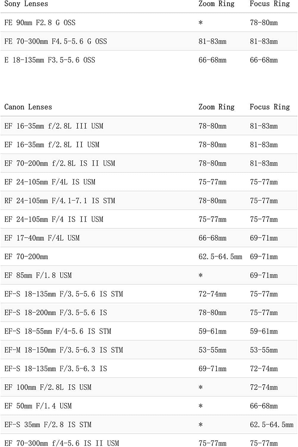 - Compatibility: Sony, Canon, Sigma, Tokina, Nikon, Fujifilm, Panasonic, Olympus, DU, Zeiss Lenses