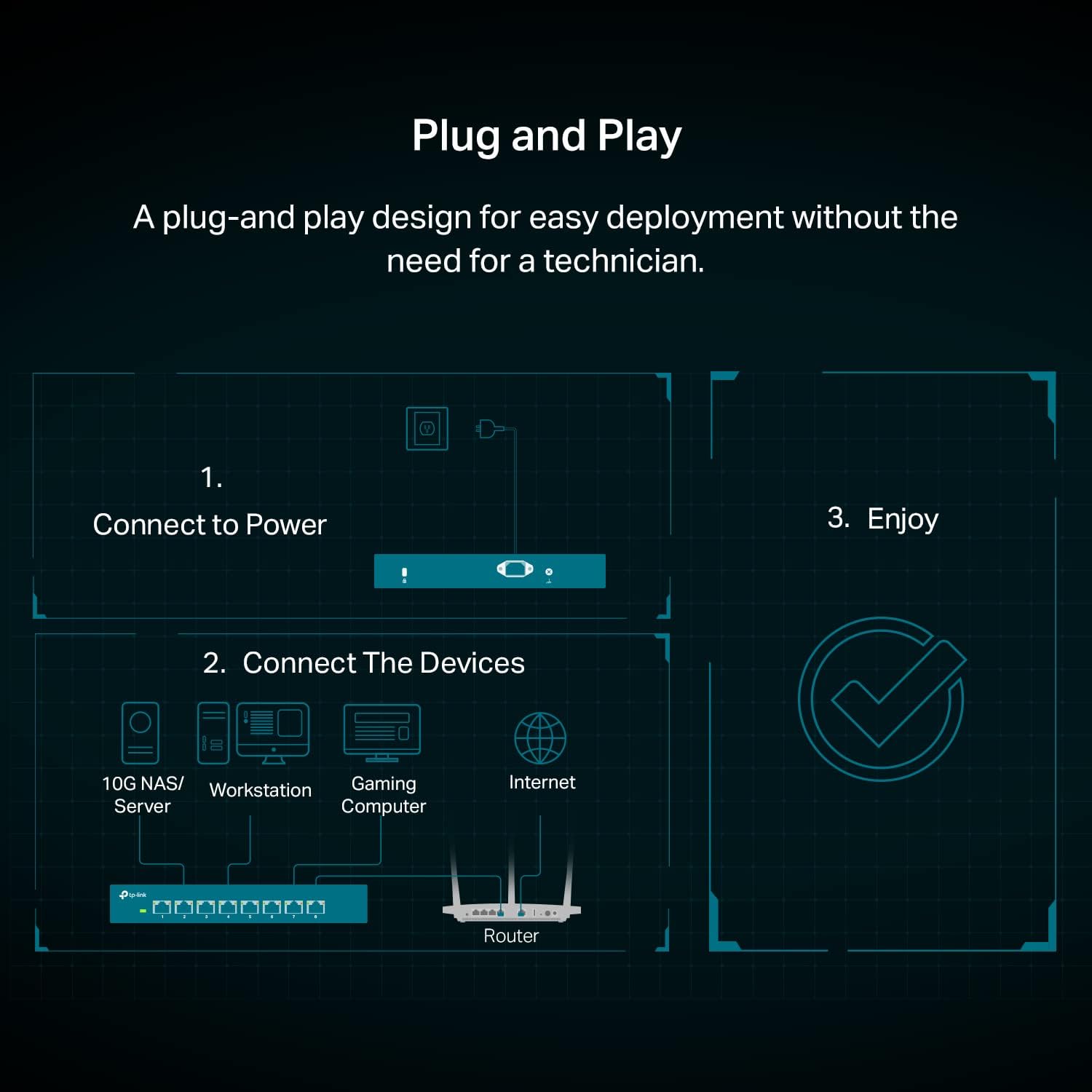 - Included Components: Installation Guide, Power Cord, TL-SX1008, Rubber Feet