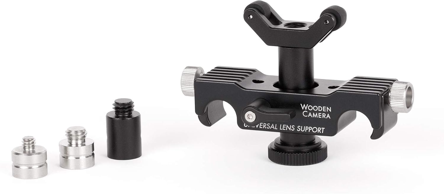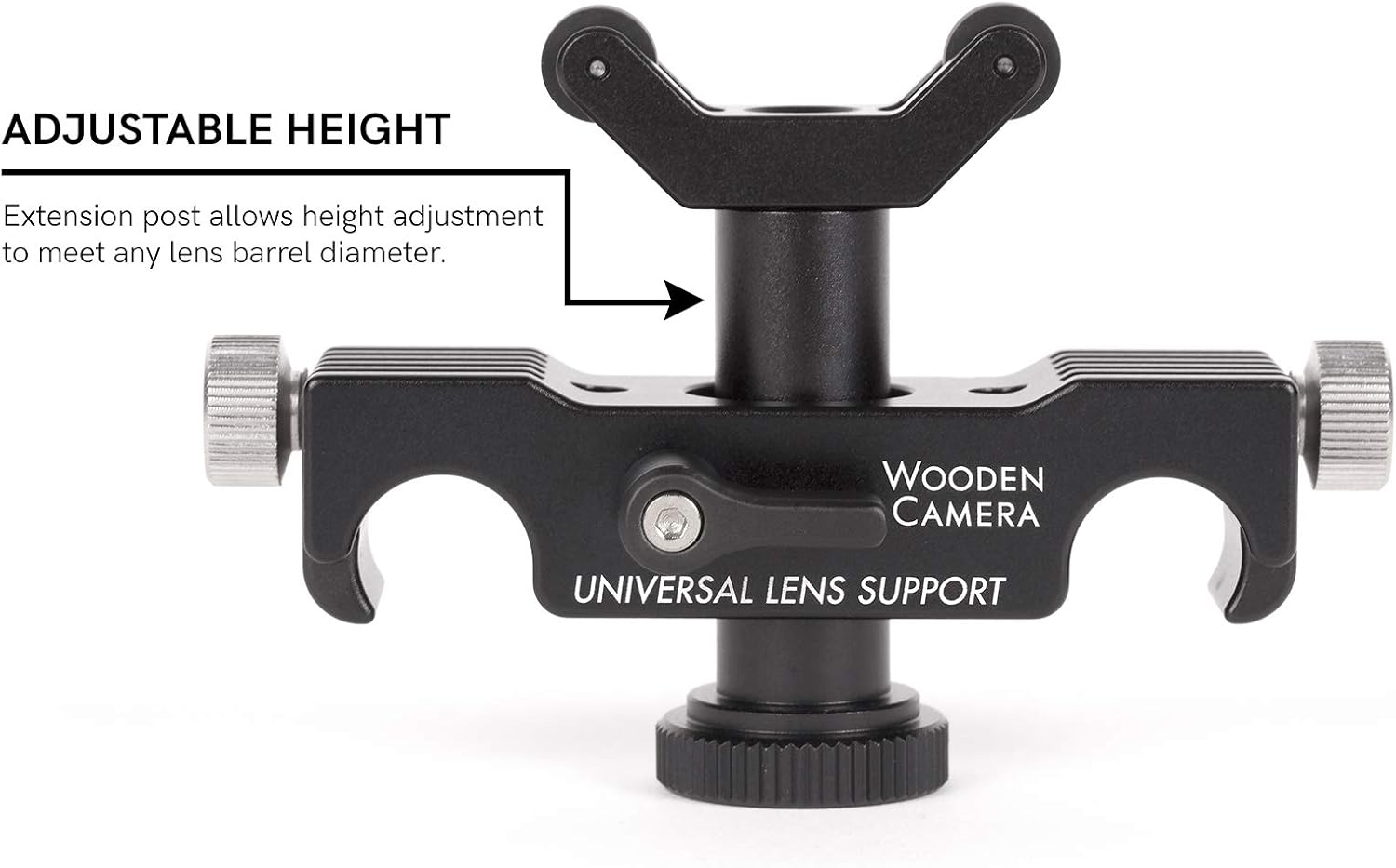 The Wooden Camera Universal Lens Support (15mm LW) provides a robust solution for stabilizing heavy lenses when using 15mm lightweight rods. This support includes a rolling Y-bracket for lenses without tripod collars, and height extension posts. Its quick, snap-on installation and adjustable height make it compatible with a wide range of lenses and baseplates.
