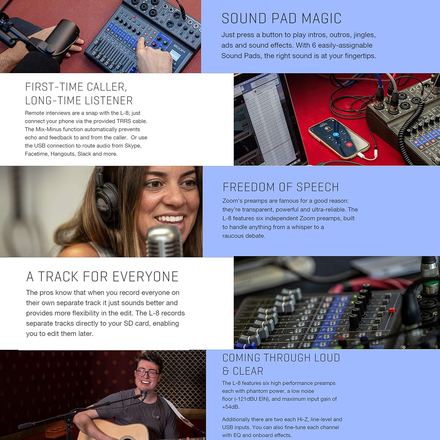 Introducing the Zoom LiveTrak L-8, a portable digital mixer and multitrack recorder designed for creators on the move. Perfect for podcasting, music production, and live performances, the L-8 offers intuitive controls and flexible powering options. This bundle includes everything you need to get started, making it the ideal solution for both beginners and seasoned professionals.